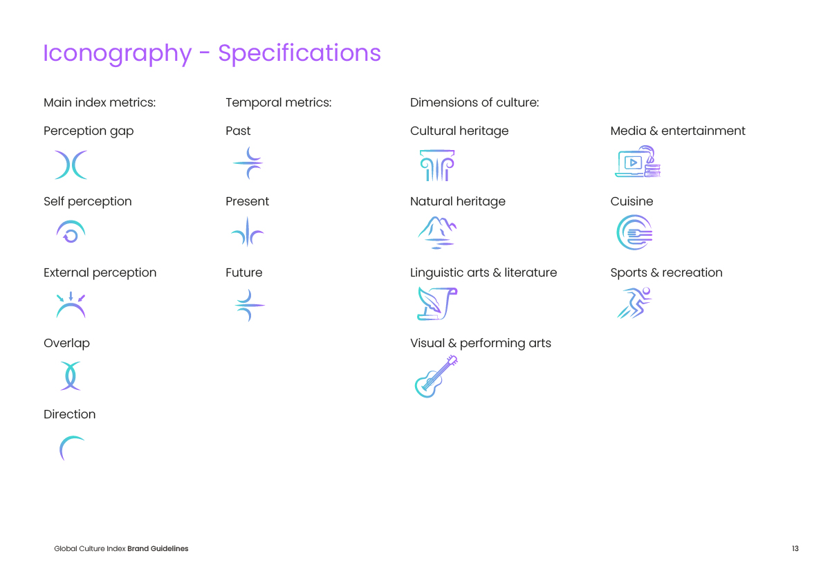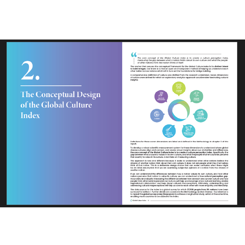 The completed identity system provided the Global Culture Index with a professional and distinctive visual presence, supporting the launch of its first edition across 50 countries and 21 languages.