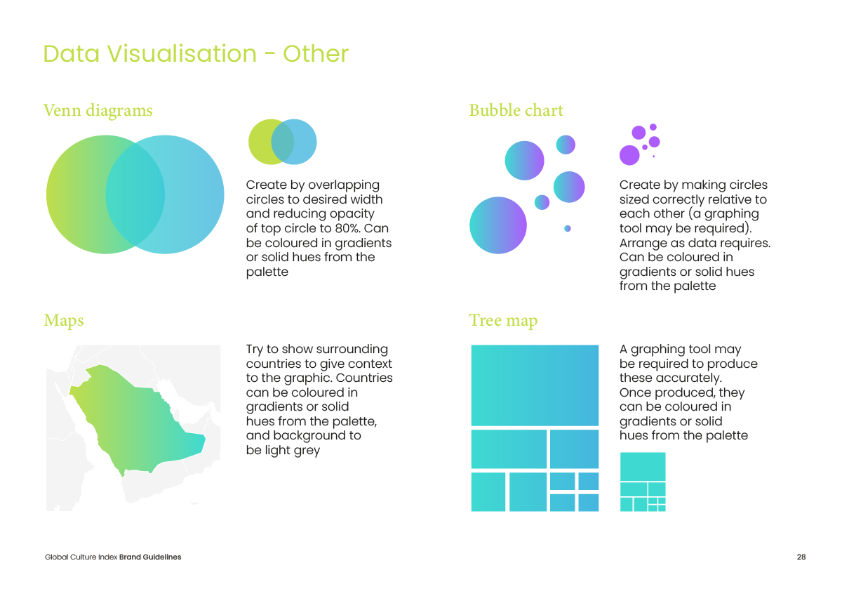 The guidelines cover a range of chart types including donut charts, bar charts, radar diagrams, line graphs, bubble charts, venn diagrams, tree maps and geographic visualisations – each designed to maintain brand consistency while prioritising data clarity.