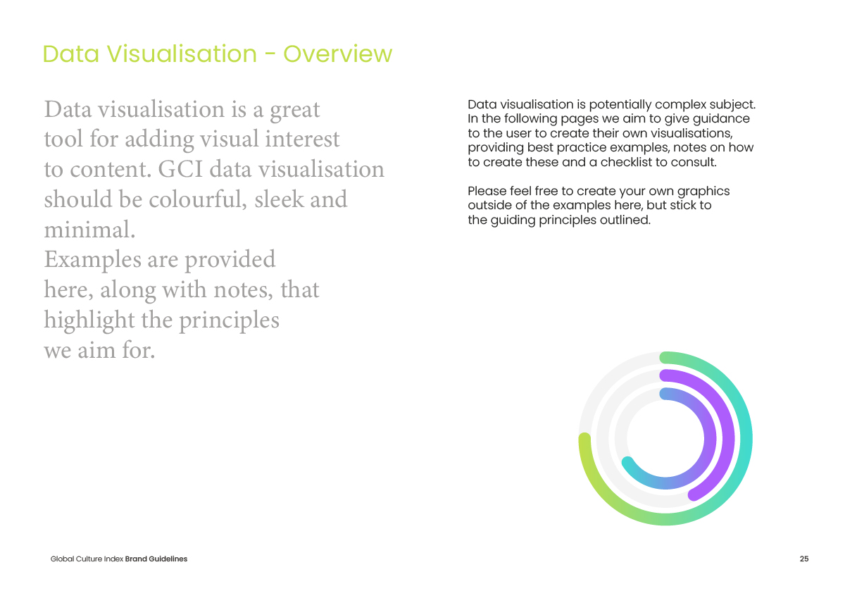 The project required a complete brand identity system for a new cultural research index, encompassing logo, visual language, data visualisation guidelines and report design.