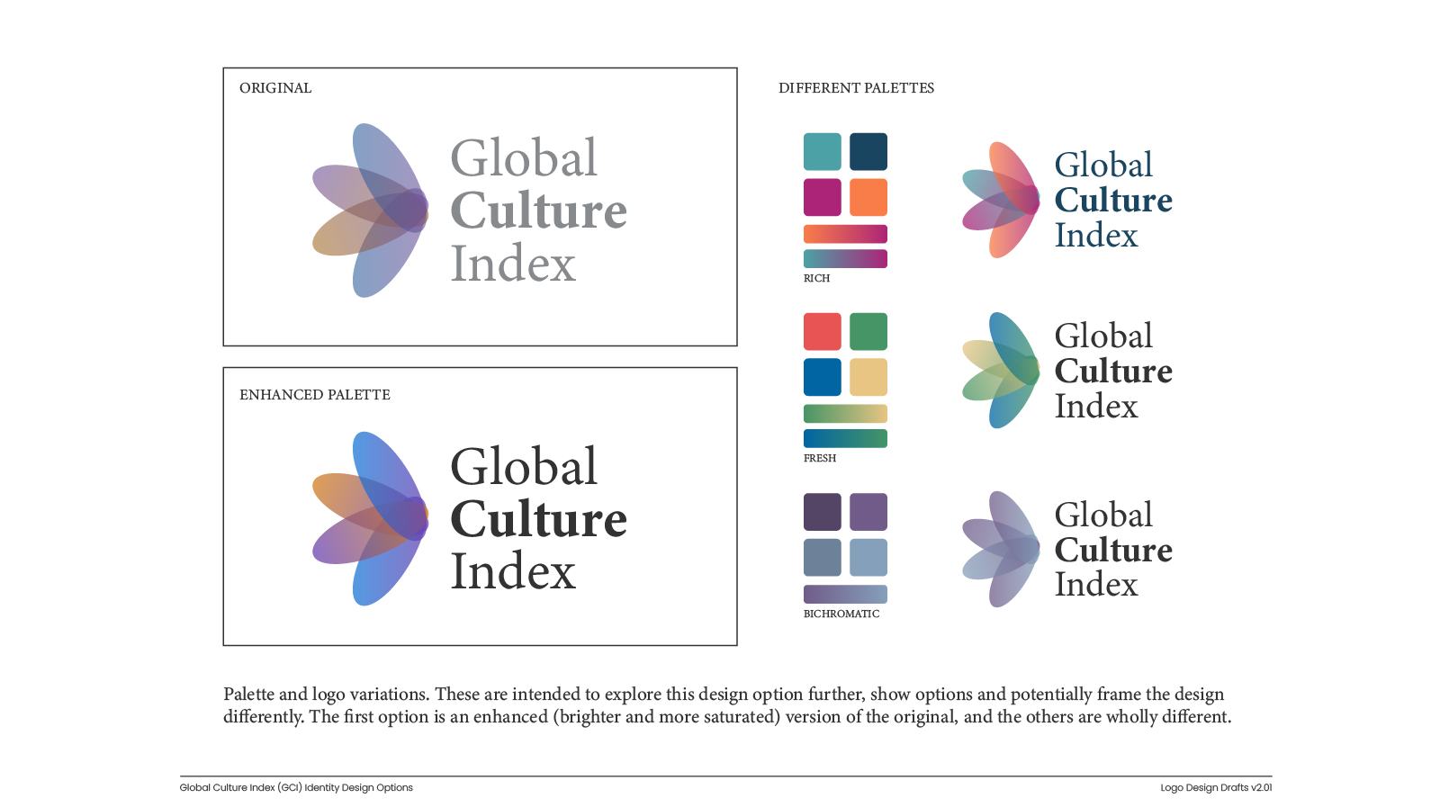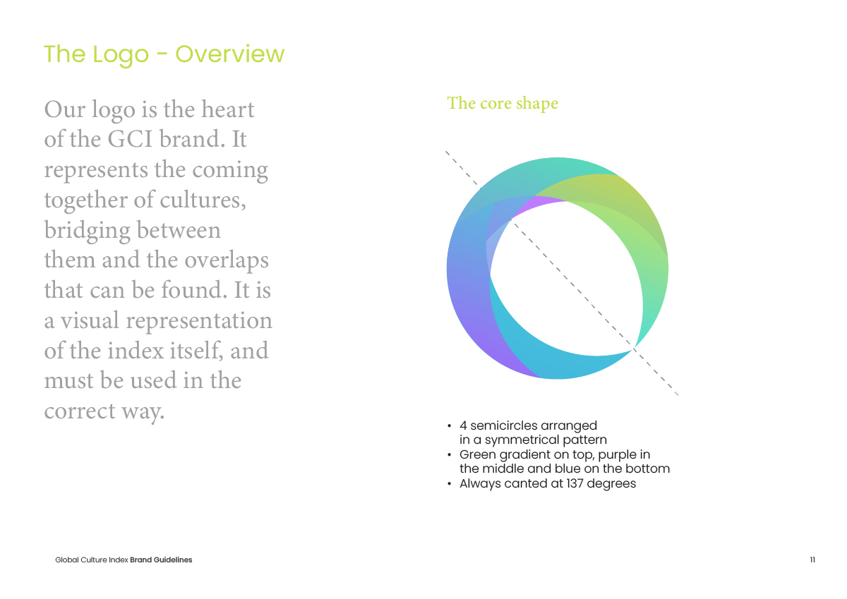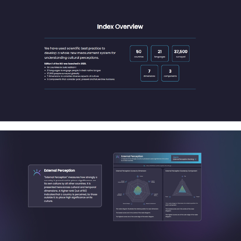 The Global Culture Index is a research initiative that measures and compares cultural perceptions across nations. It required a brand identity that could communicate the scale and rigour of the project while remaining accessible and visually engaging.