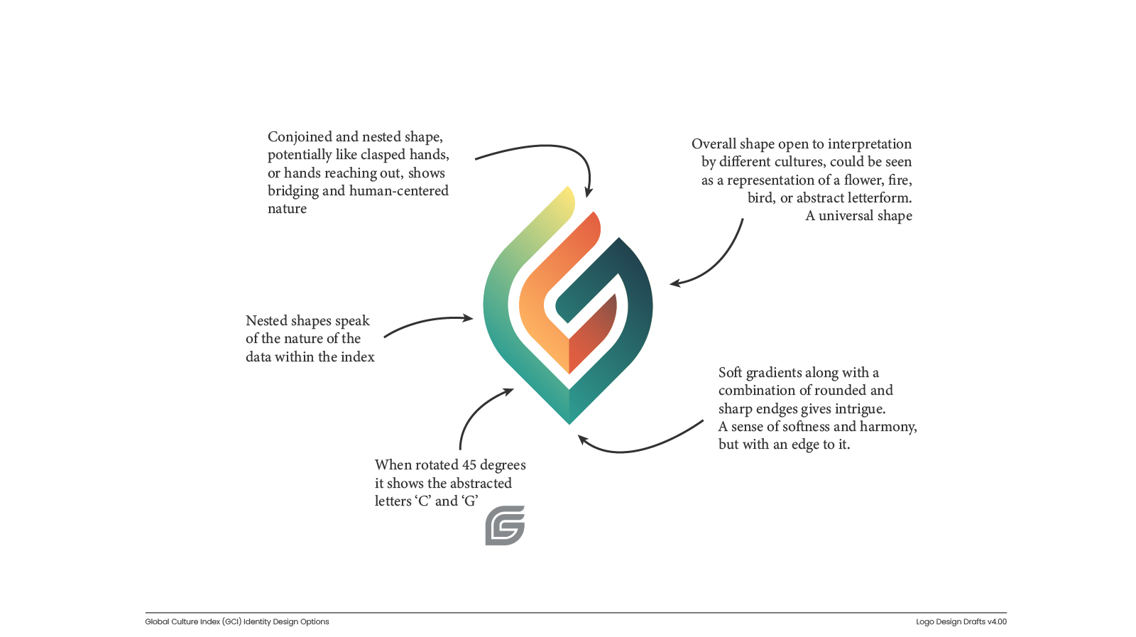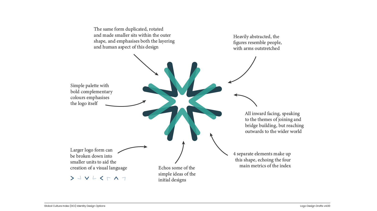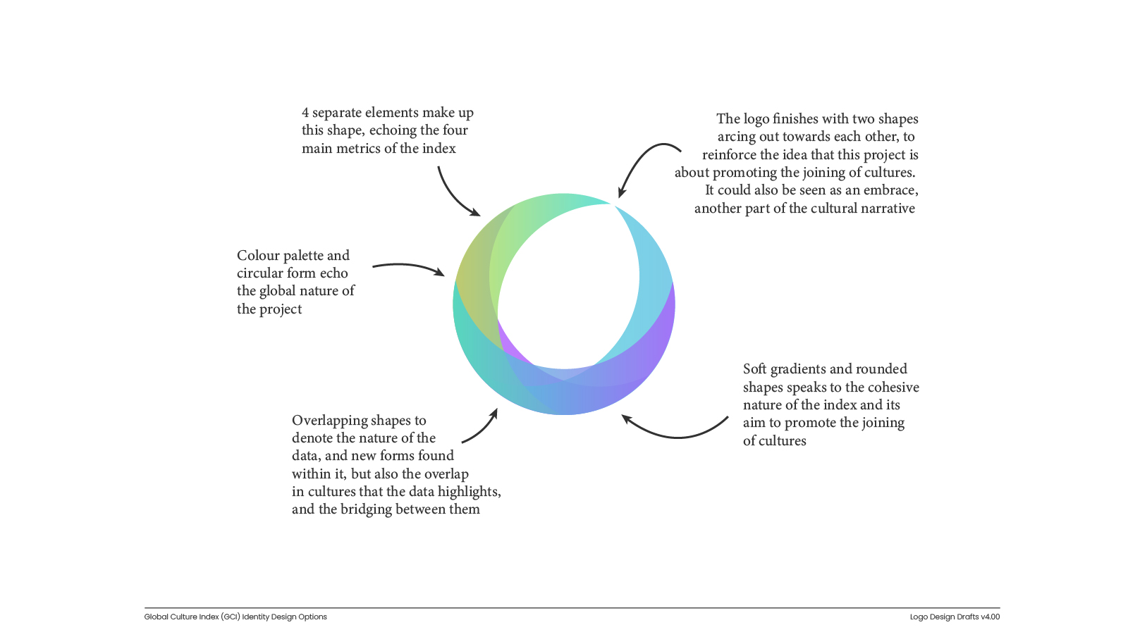 Early explorations tested a range of visual metaphors – from geometric forms representing interconnection and overlap, to more organic shapes suggesting cultural exchange and human connection.
