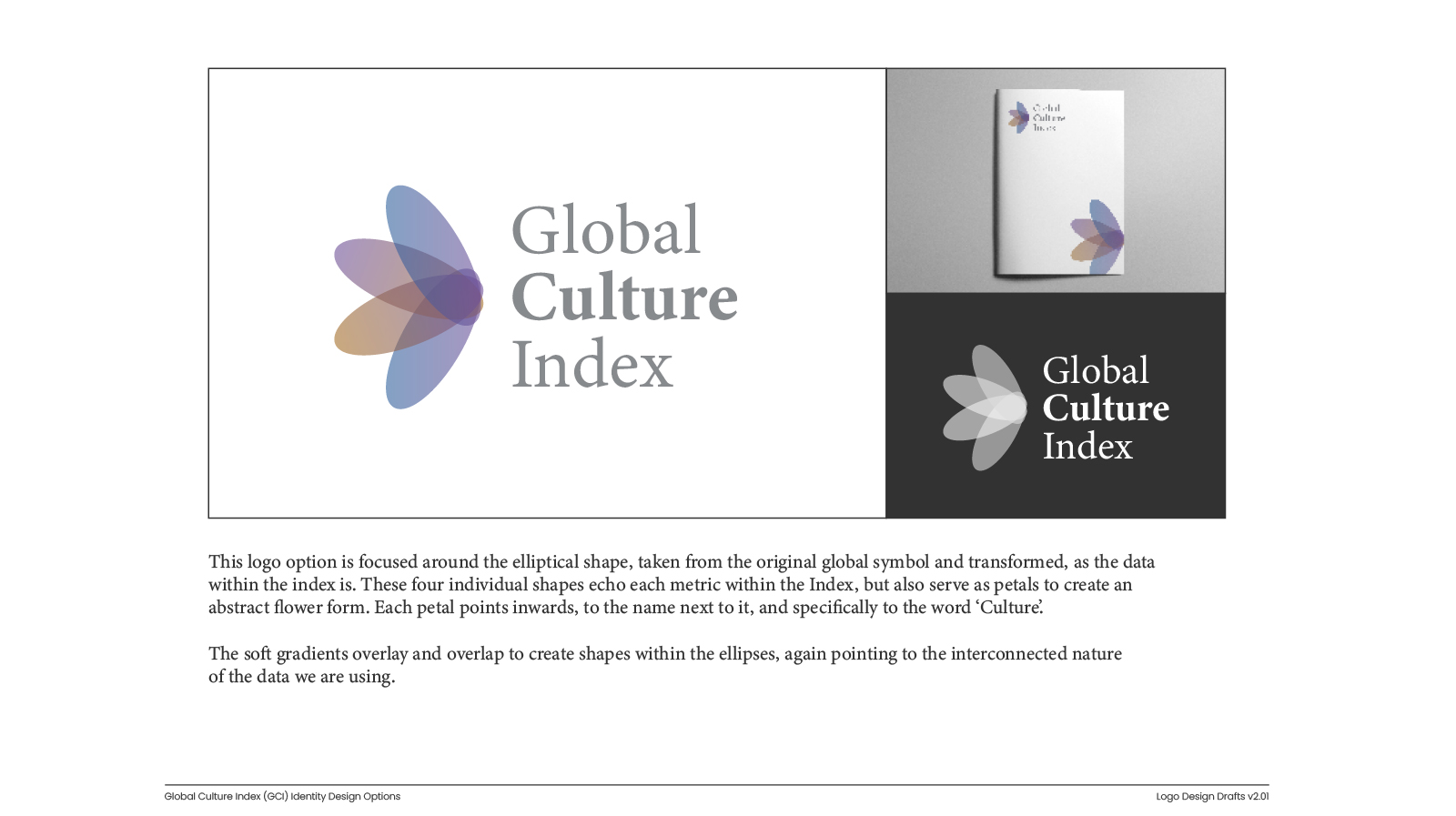 The selected direction centres on a logo form built from four overlapping petal shapes, representing the convergence of cultural dimensions measured by the index. The shape suggests both a global form and the idea of cultural intersection.