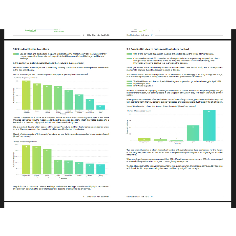 The report design balances dense data presentation with clear navigation and visual hierarchy, ensuring that complex cultural insights are communicated effectively to diverse audiences.